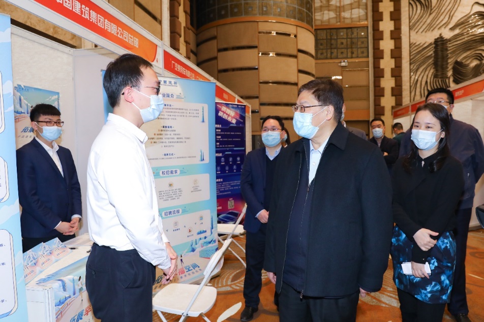洽談會現場 3月19日上午,邱水平來到綜合場的第一場洽談會,與到場求職的畢業生和參與用人單位親切交談。他駐足翻看學生簡歷,詢問和了解用人單位的招聘情況和人才政策。綜合場次的招聘單位涵蓋醫藥、建筑、能源、互聯網、金融等多個領域,為不同專業背景的畢業生提供豐富的崗位選擇。其中一家參會企業——中芯國際由北大信息科學技術學院王陽元院士創建,邱水平與中芯國際招聘人員親切攀談,并勉勵在場的畢業生要傳承紅色基因,為國家戰略需求和民族復興大業添磚加瓦。