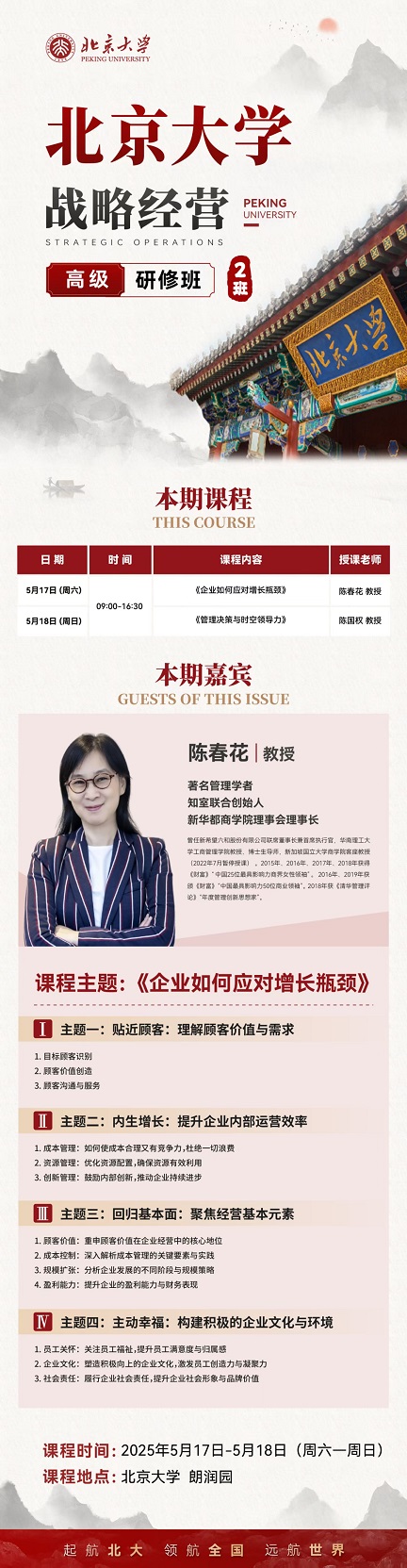 | ?上一篇:北大總裁班2025年5月最新動態 ?下一篇:北京大學新媒體時代工商管理班4月開學典禮課程 |