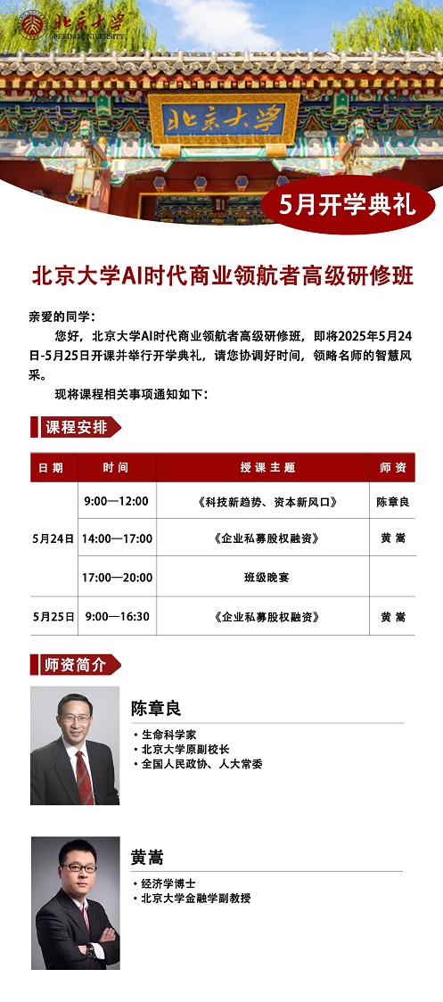 | ?上一篇:北京大學區域經濟發展與中國企業家高端研修班5月開課通知 ?下一篇:北京大學金融與投資(私募、基金)研修班2025年6月 28-29日開課通知 |