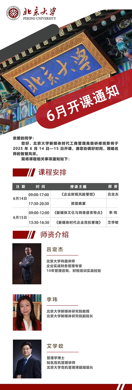 北京大學新媒體時代工商管理高級研修班即將于2025年6月14日-15日開課,請您協調好時間,領略名師的智慧風采。