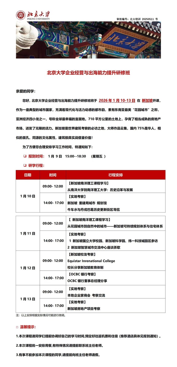 ![]() 北大企業經營與出海能力提升研修班落地新加坡啦! 2026年1月10-13日,從南洋理工的課程學習到新加坡重建局、OCBC銀行等實地考察,從城市規劃到企業出海實踐,沉浸式解鎖新加坡發展密碼,與行業大咖、校友深度交流,助力企業出海能力升級,這場研學之旅值得期待! |